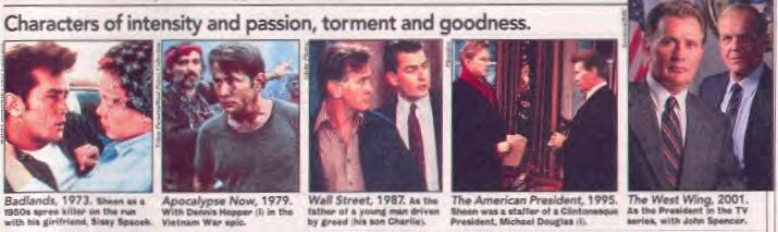 in films such as Badlands, Apocalypse Now and Wall Street, to his current role as President Josiah Bartlet